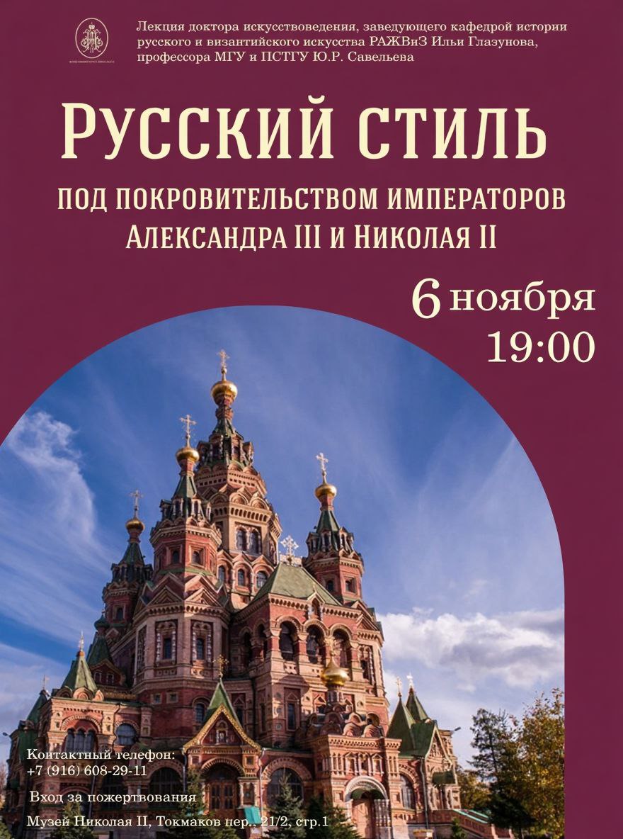 6 ноября, в четверг, в 19:00 приглашаем Вас на лекцию доктора искусствоведения, профессора, заведующего кафедрой истории русского и византийского искусства РАЖВиЗ Ильи Глазунова Юрия Ростиславовича Савельева "РУССКИЙ СТИЛЬ ПОД ПОКРОВИТЕЛЬСТВОМ ИМПЕРАТОРОВ АЛЕКСАНДРА III И НИКОЛАЯ II".
