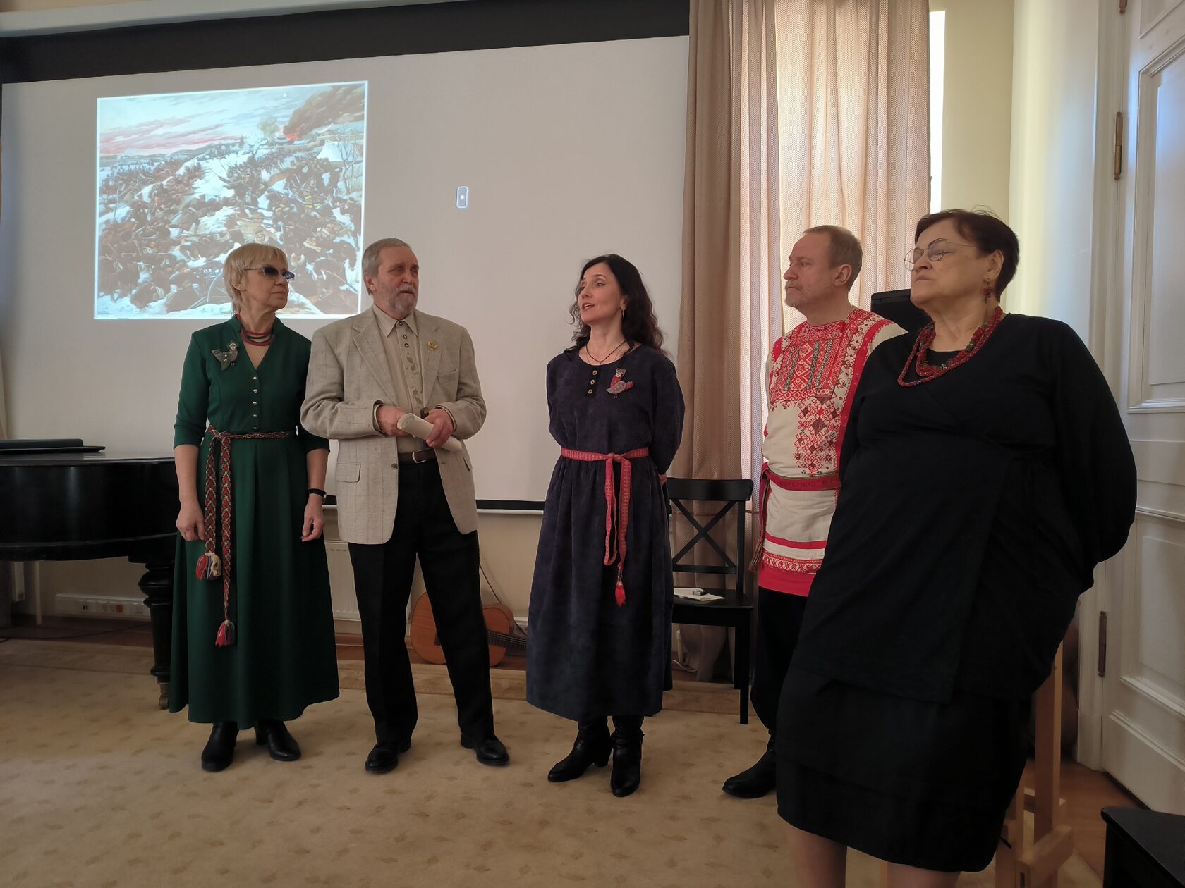 Рассказ был дополнен музыкальными произведениями - народными в исполнении ансамбля "Русская музыка" и академическими в исполнении Анастасии Коротковой (сопрано). Вёл программу и рассказал о ходе Русско-японской войны Владимир Иванов.