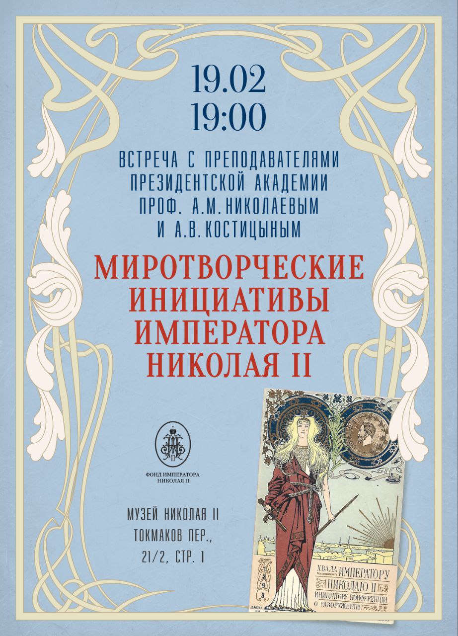 19 февраля в 19:00 Фонд Императора Николая II приглашает Вас на встречу с преподавателями Президентской Академии (РАНХиГС) на тему "МИРОТВОРЧЕСКИЕ ИНИЦИАТИВЫ ИМПЕРАТОРА НИКОЛАЯ II".